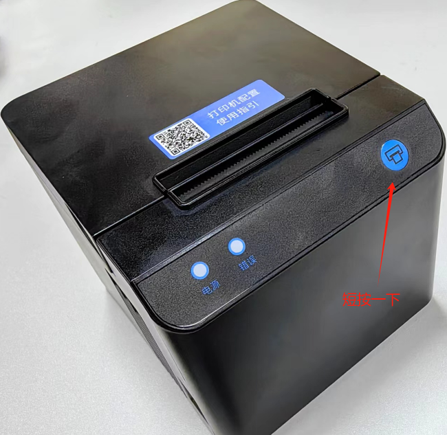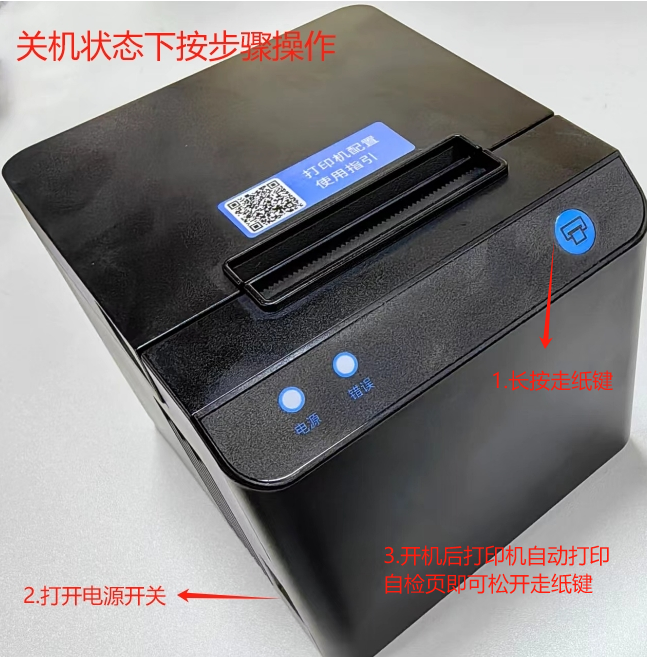 ③按住走纸键不松开,并打开打印机电源,此时打印机会自动打印出自检测试页,即可松开走纸键。